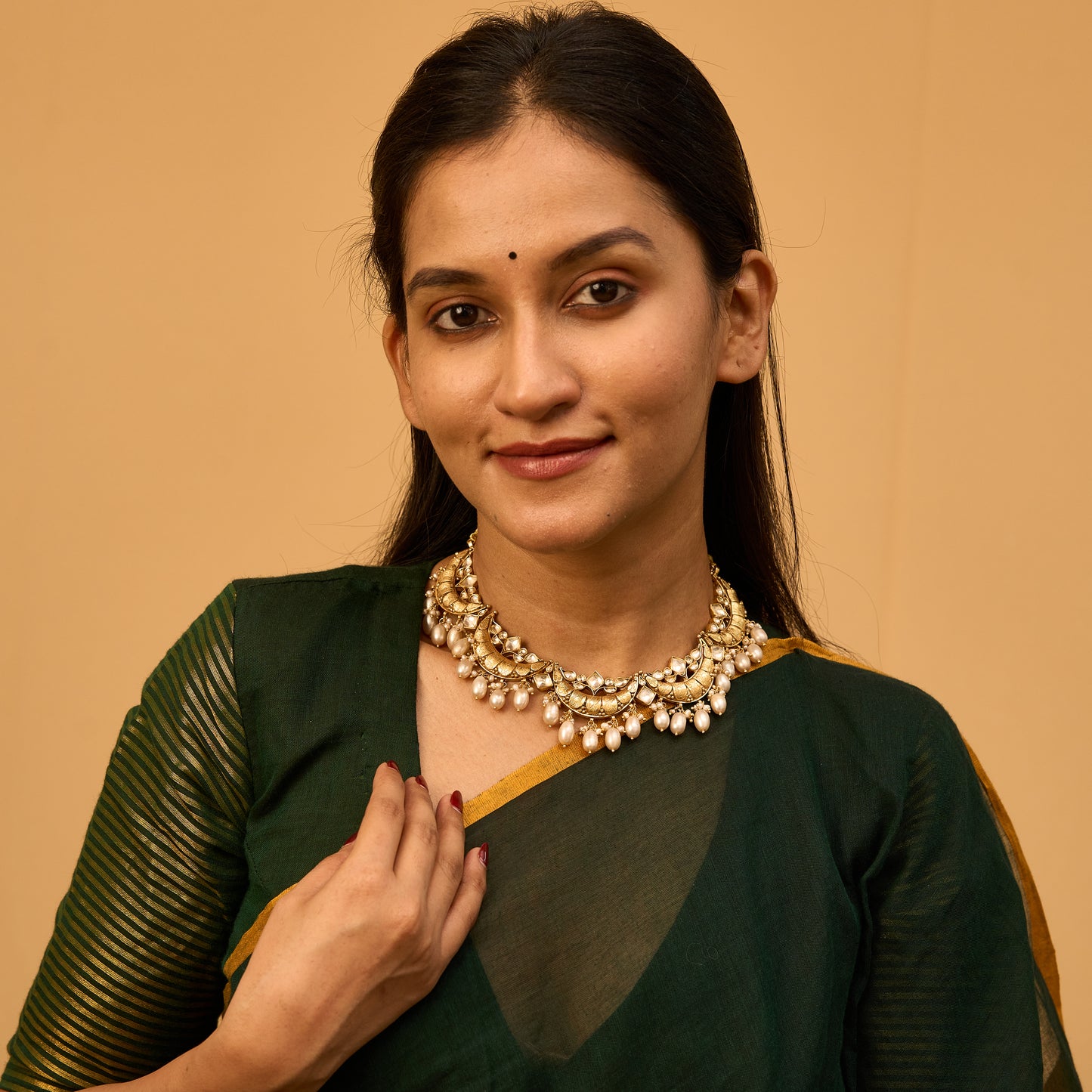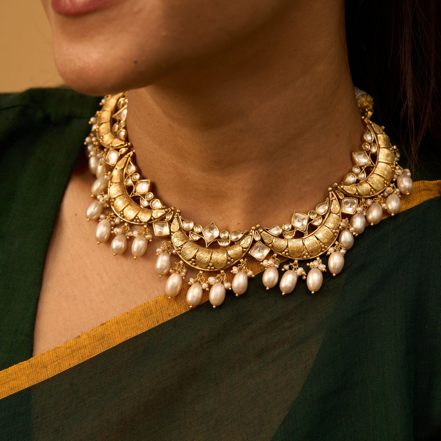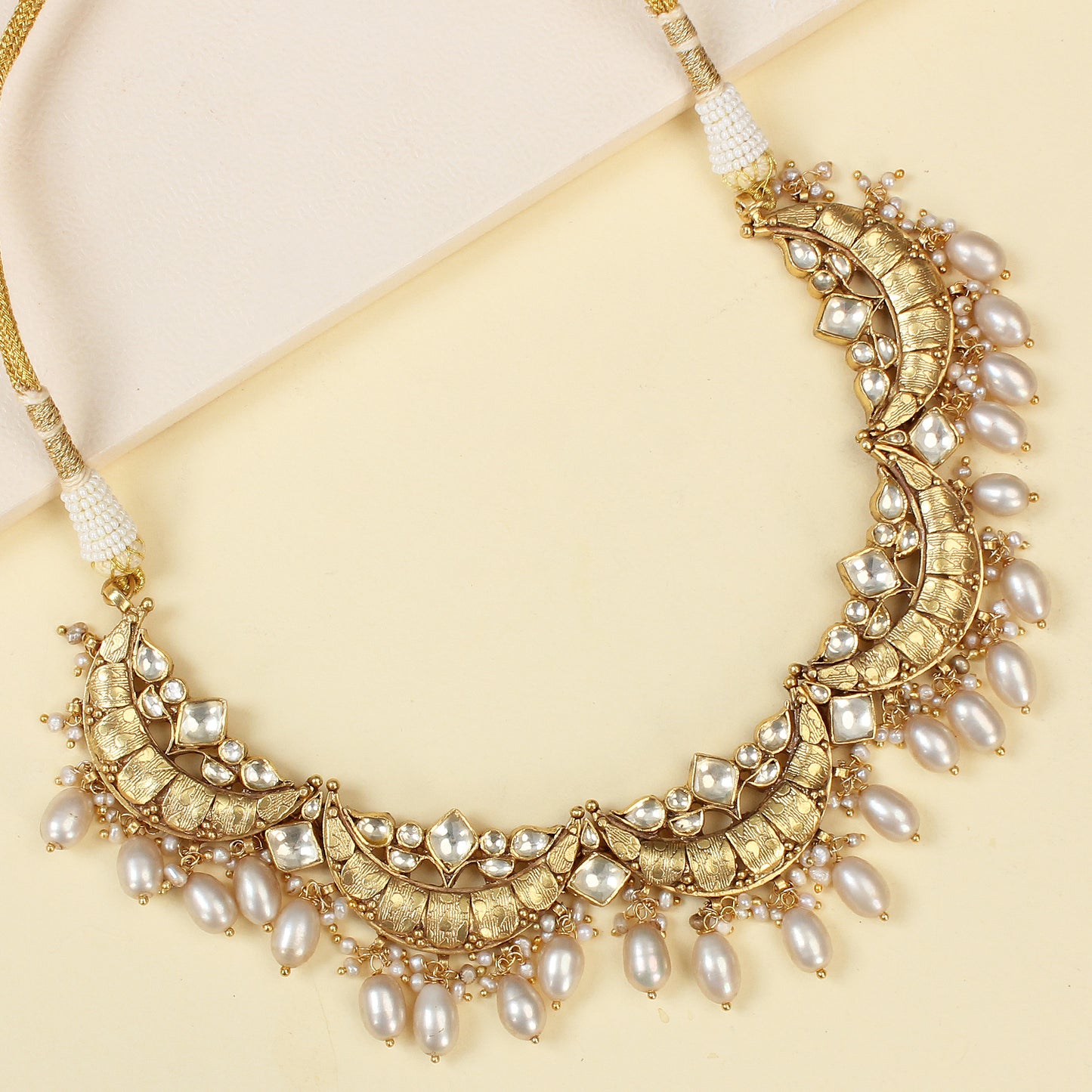 Experience timeless elegance with our Gold Plated Moissanite Pearl Necklace. This exquisite piece combines the classic lustre of pearls with the brilliant sparkle of moissanite stones, creating a truly captivating accessory. Set in a 92.5 Sterling Silver base with rich gold plating, this pearl necklace is the epitome of grace and sophistication. It's the perfect choice for formal events, bridal wear, or as a cherished gift that exudes luxury.