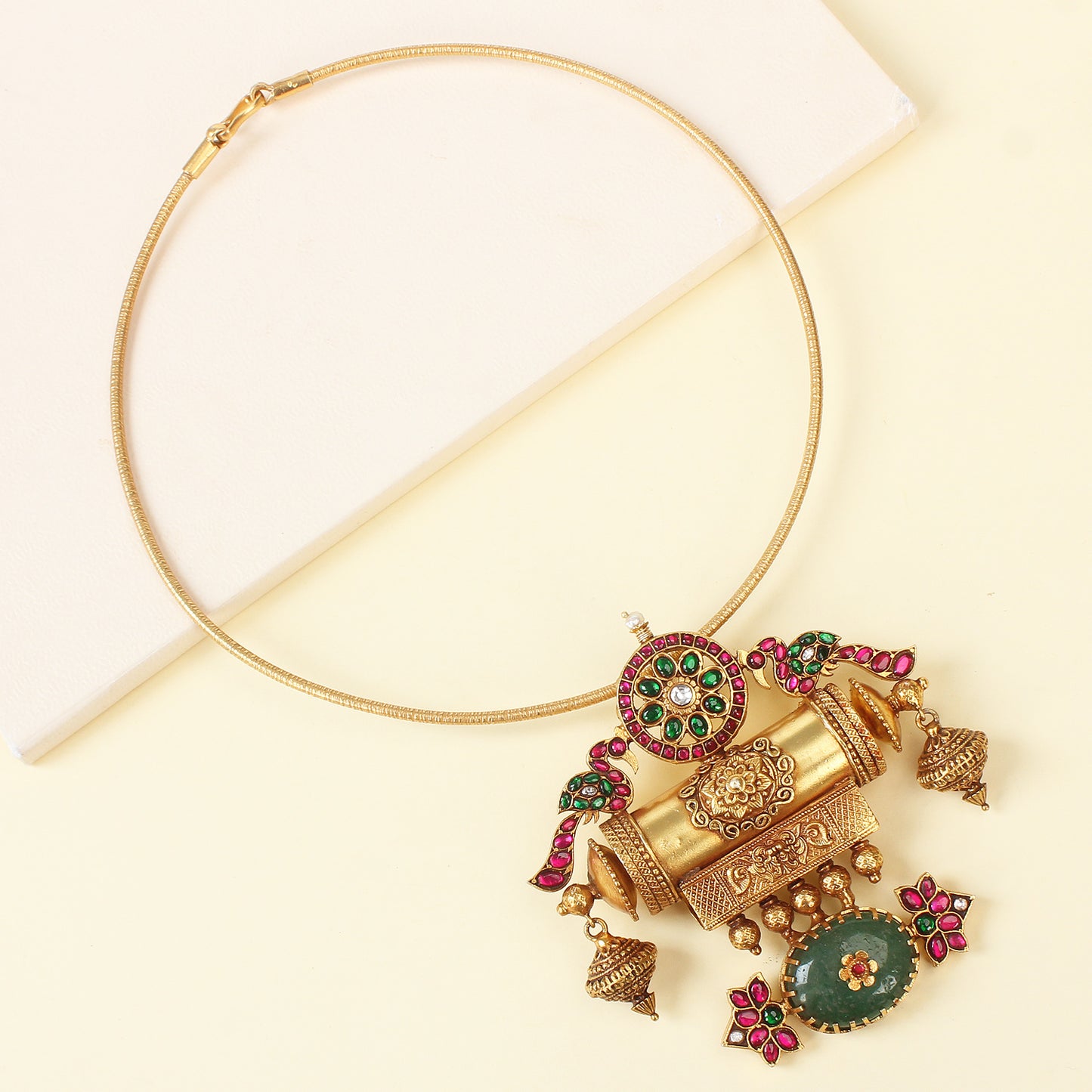 Blending regal Elegance with rich tradition, this Stone Hasli Necklace is a tribute to timeless temple jewellery. Intricately handcrafted in antique Nagas design, it features carefully embedded semi-precious stones that add a subtle yet striking brilliance. With a bold gold finish and vintage flair, this piece is a graceful addition to any festive or cultural wardrobe.