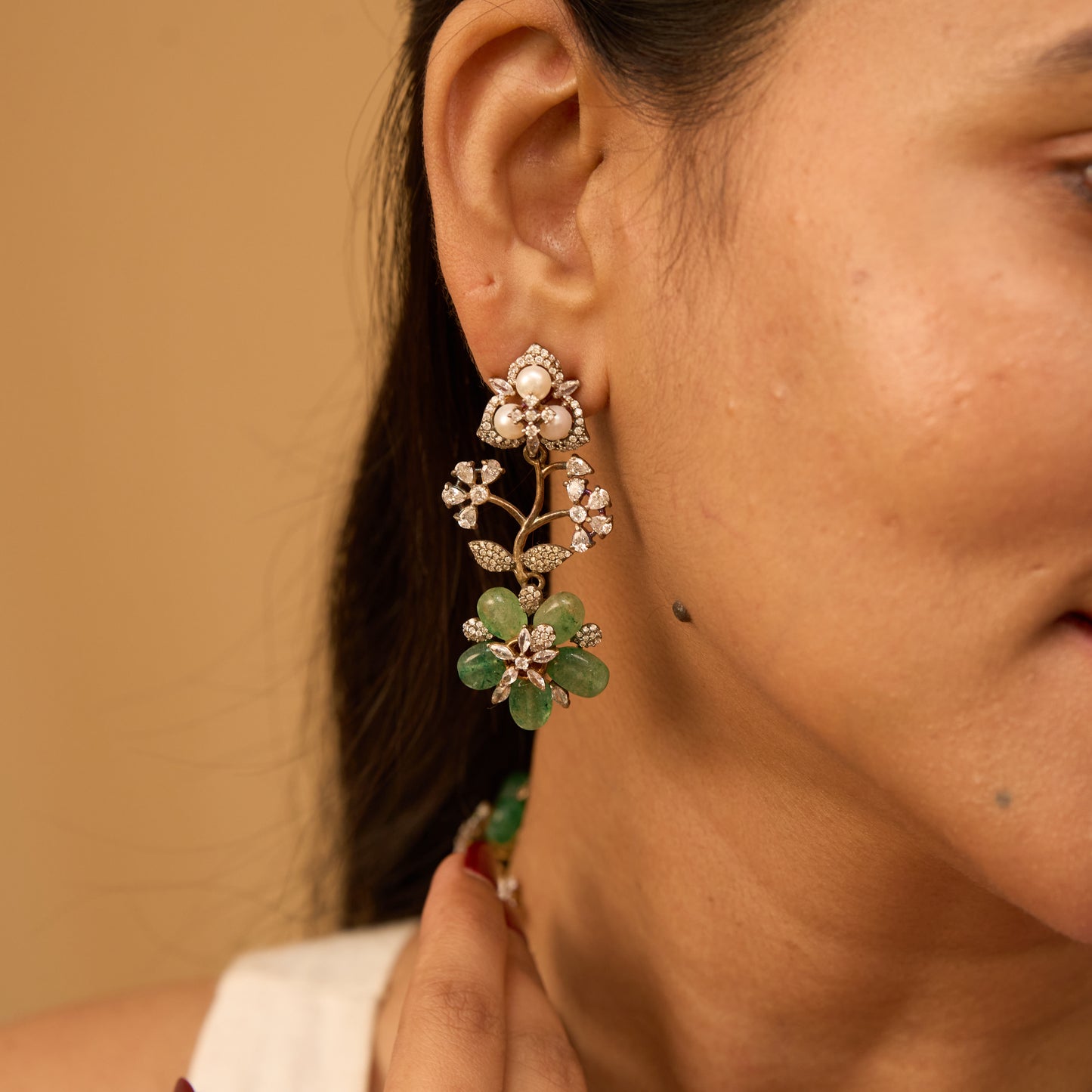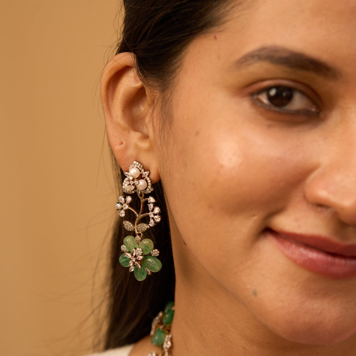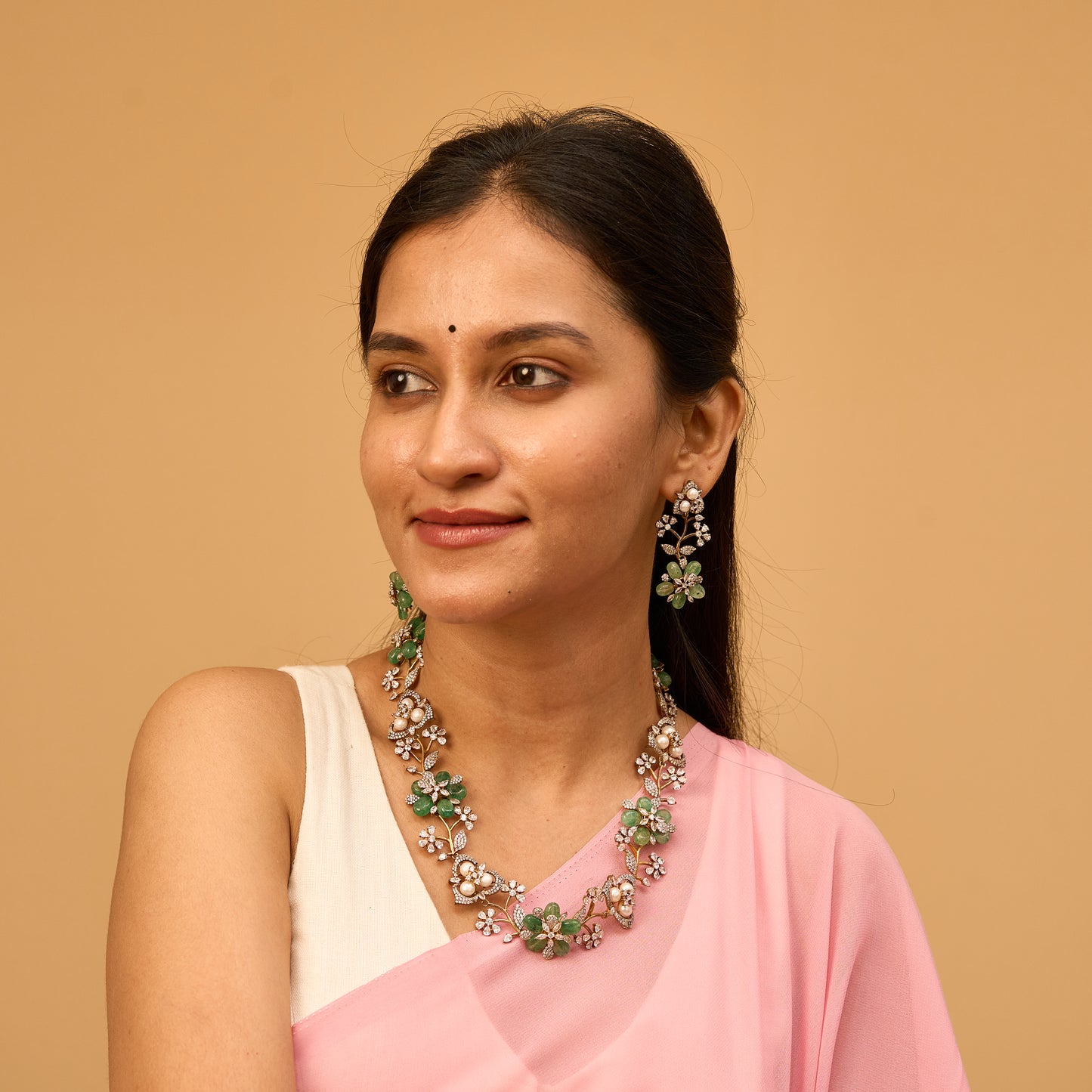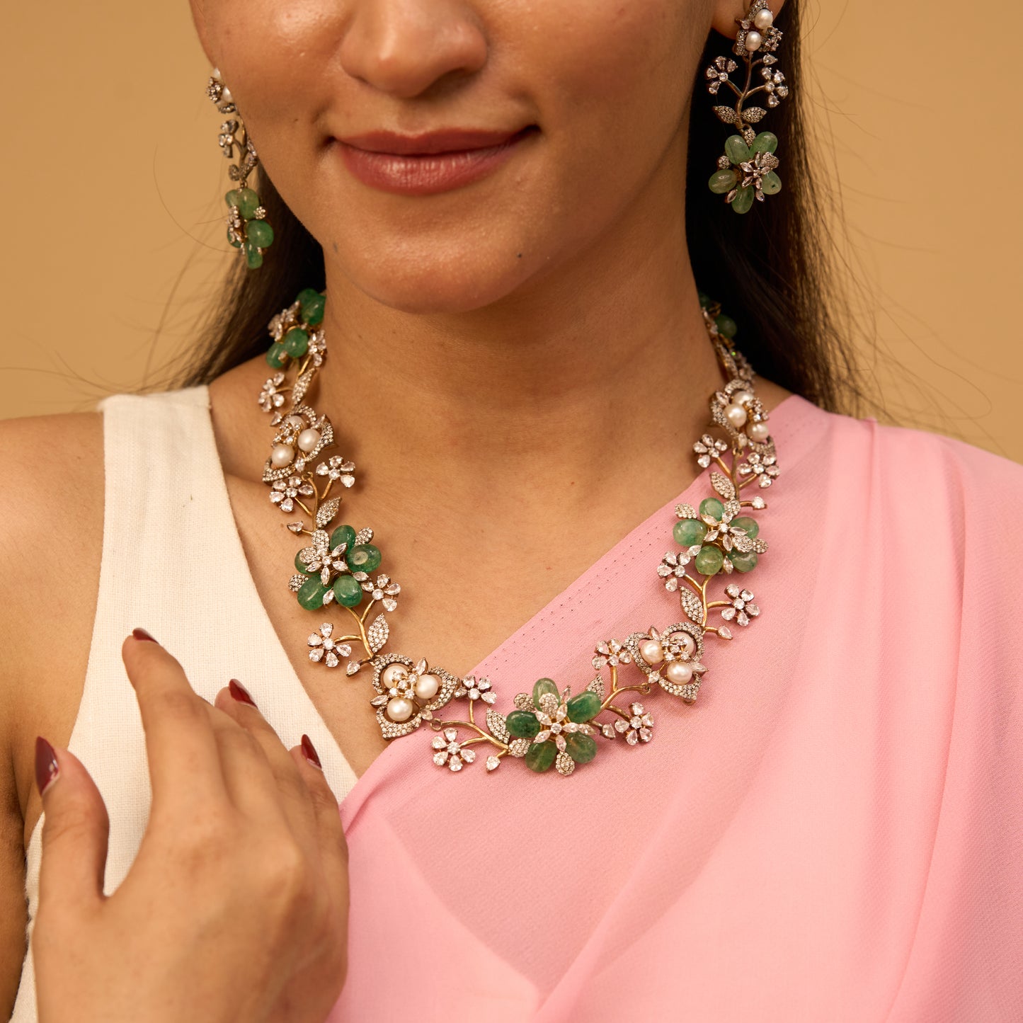 Victorian Floral Green Sapphire Necklace With Earrings