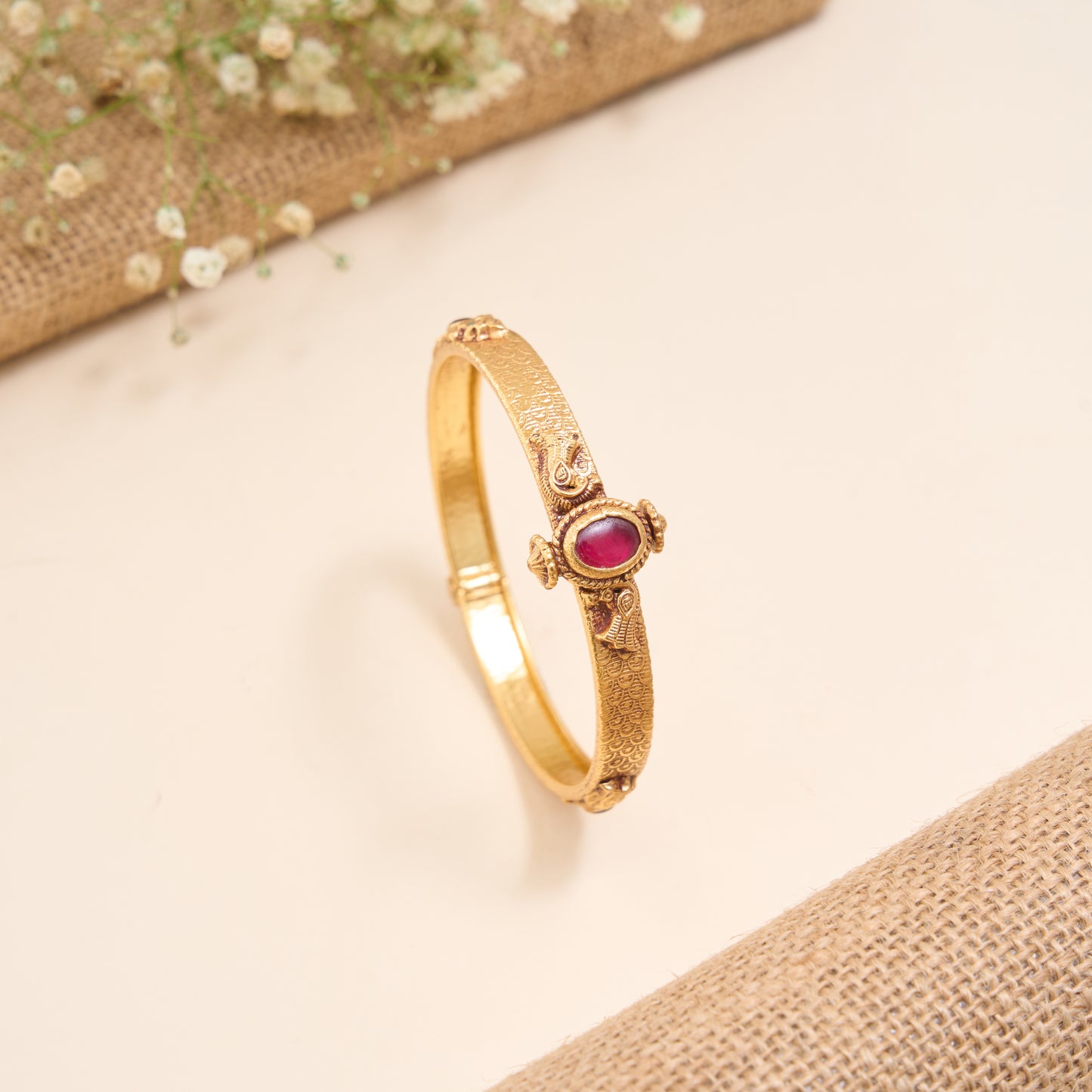 This gold-plated silver screw bangle showcases an intricately engraved design paired with a vibrant red stone, making it a stunning accessory for special occasions. The secure screw closure offers a comfortable and reliable fit, adding both elegance and confidence to your look. Perfect for adding a refined touch to your jewelry collection or gifting to someone special.